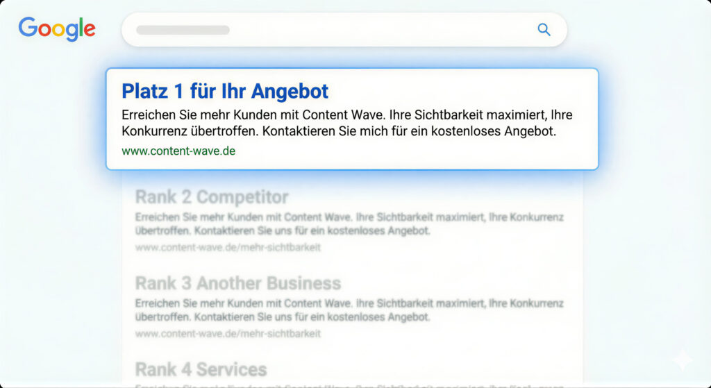 Ich bringe Ihr Angebot bei Google und den Suchmaschinen nach ganz oben. Wir sorgen dafür, dass Ihre Zielgruppe an Ihnen nicht mehr vorbeikommt, wenn sie nach Ihrer Lösung sucht.